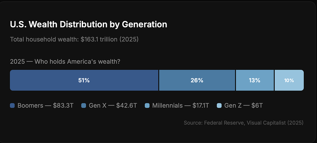 Walk around Aspen and you notice something: the average billionaire is about 65 years old. Their wealth is concentrated in traditional assets — equities, real estate, private companies. And it's not just billionaires. Look at how wealth is distributed across generations in America: